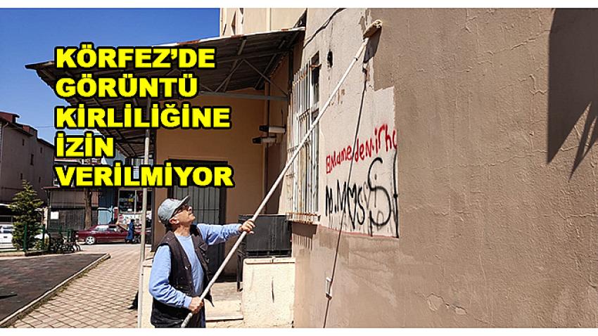 Körfez’de kamuya açık alanlarda görüntü kirliliği oluşturan anlamsız duvar yazıları ve çizimleri, belediye ekiplerince temizleniyor