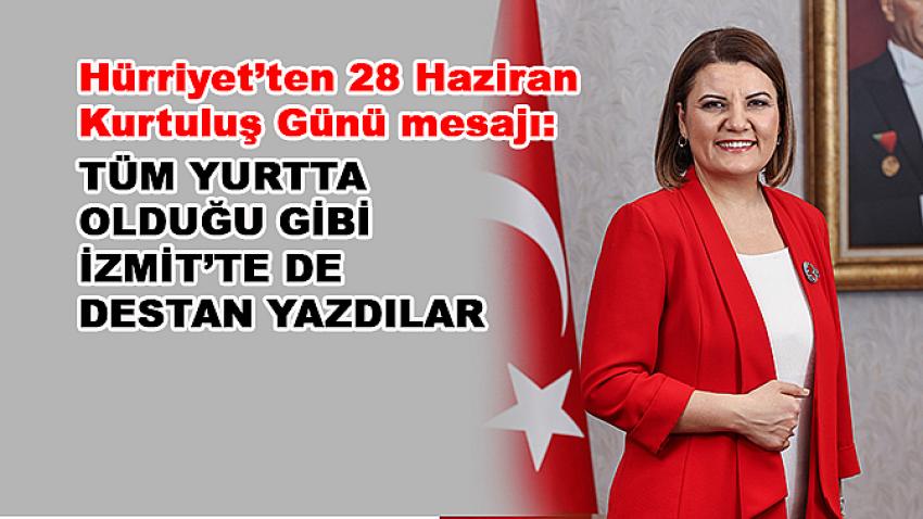 İzmit Belediye Başkanı Av. Fatma Kaplan Hürriyet, 28 Haziran İzmit’in Kurtuluş Günü’nün 101.yıldönümü nedeniyle mesaj yayınladı. Hürriyet, “Bağımsızlığını her şeyden üstün tutan Türk Milleti gibi İzmitliler de 101 yıl önce Anadolu’nun işgal edilemeyeceğini dünyaya gösterdi. 28 Haziran 1921’de tüm yurtta olduğu gibi, bu kentte de vatanseverler üzerine düşeni yaptı ve cumhuriyetimizin kurucusu ebedi başkomutanımız Gazi Mustafa Kemal Atatürk önderliğinde başlatılan kurtuluş mücadelesinde İzmit’te destan yazdı.